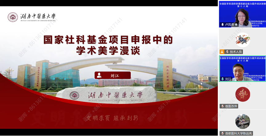 2025年6月27日下午,全国医学英语师资培训课程建设能力提升培训讲座第十八期特邀湖南中医药大学外国语学院副院长刘江教授做《国家社科基金项目申报中的学术美学漫谈》报告。成人电影 成人电影 院长卢凤香教授主持讲座。